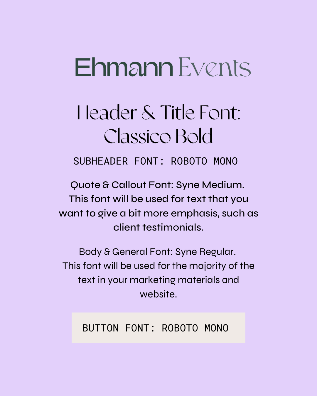 At a minimum, designers should provide you with header, subheader, accent, and body font selections (and sometimes more for folks who need to mix up their graphics more often!). This allows your brand to appear intentional, professional, and engaging across all of your marketing platforms.